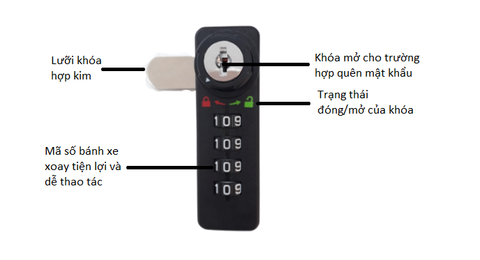 - Sản phẩm khóa số đi kèm với master key dự phòng trong trường hợp người sử dụng quên mật khẩu khóa số